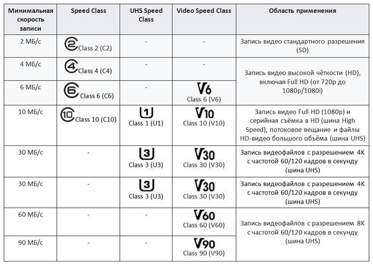 - Video Speed Class: V6, V10, V30, V60, V90 — обозначают минимальную скорость записи соответственно 6, 10, 30, 60 и 90 МБ/с.