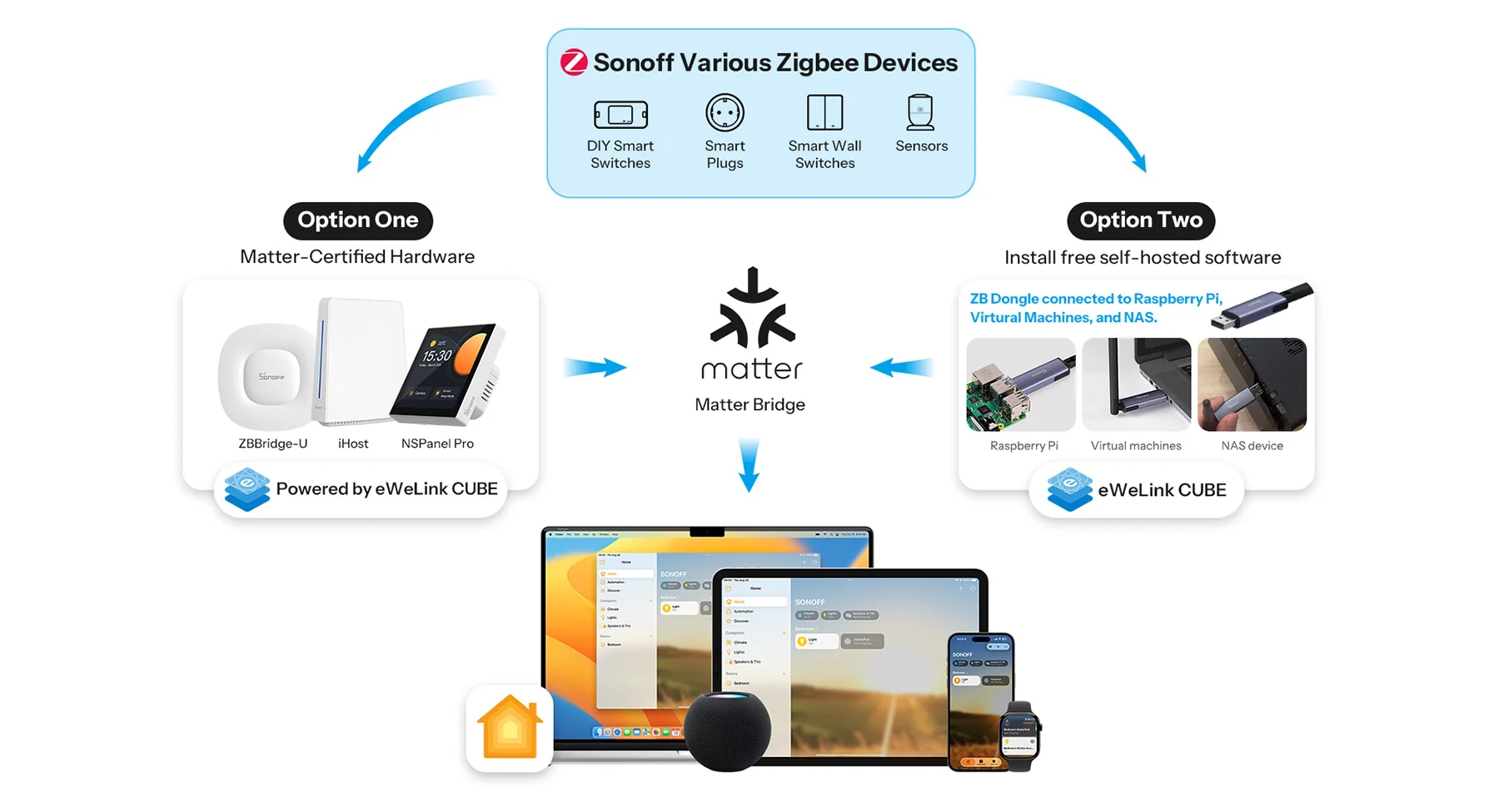Все решения интегрируют устройства SONOFF Zigbee в вашу экосистему Apple через Matter Bridge, обеспечивая бесперебойное управление устройствами.